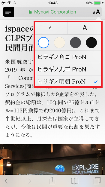 右上の「AA」をタップすれば、文字のフォントや背景色を変えることもできます。Safariリーダーを使えば、設定を行わなくても、いま表示されている画面の広告を消しながら、背景色などを変えて、自分の読みやすい形に変更することが可能なのです。